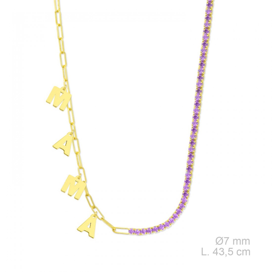 Gargantilla de Plata de Ley chapado en oro con la palabra MAMA en charms y cadena con circonitas de color amatista.