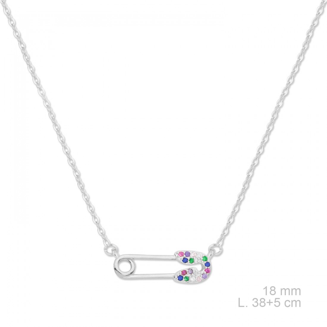 Gargantilla de Plata de Ley de la que cuelga un pequeño imperdible de 18 mm con circonitas de colores.