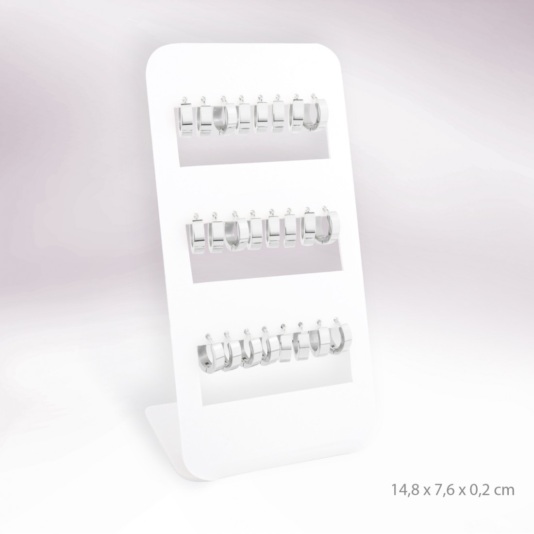 Expositor de resina con 12 pares de Aros de Acero inoxidable unisex en color plateado.