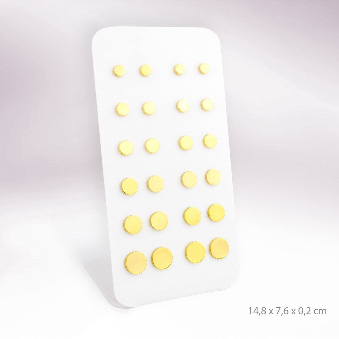 Expositor de resina con 12 pares de pendientes de Acero inoxidable unisex en color dorado.