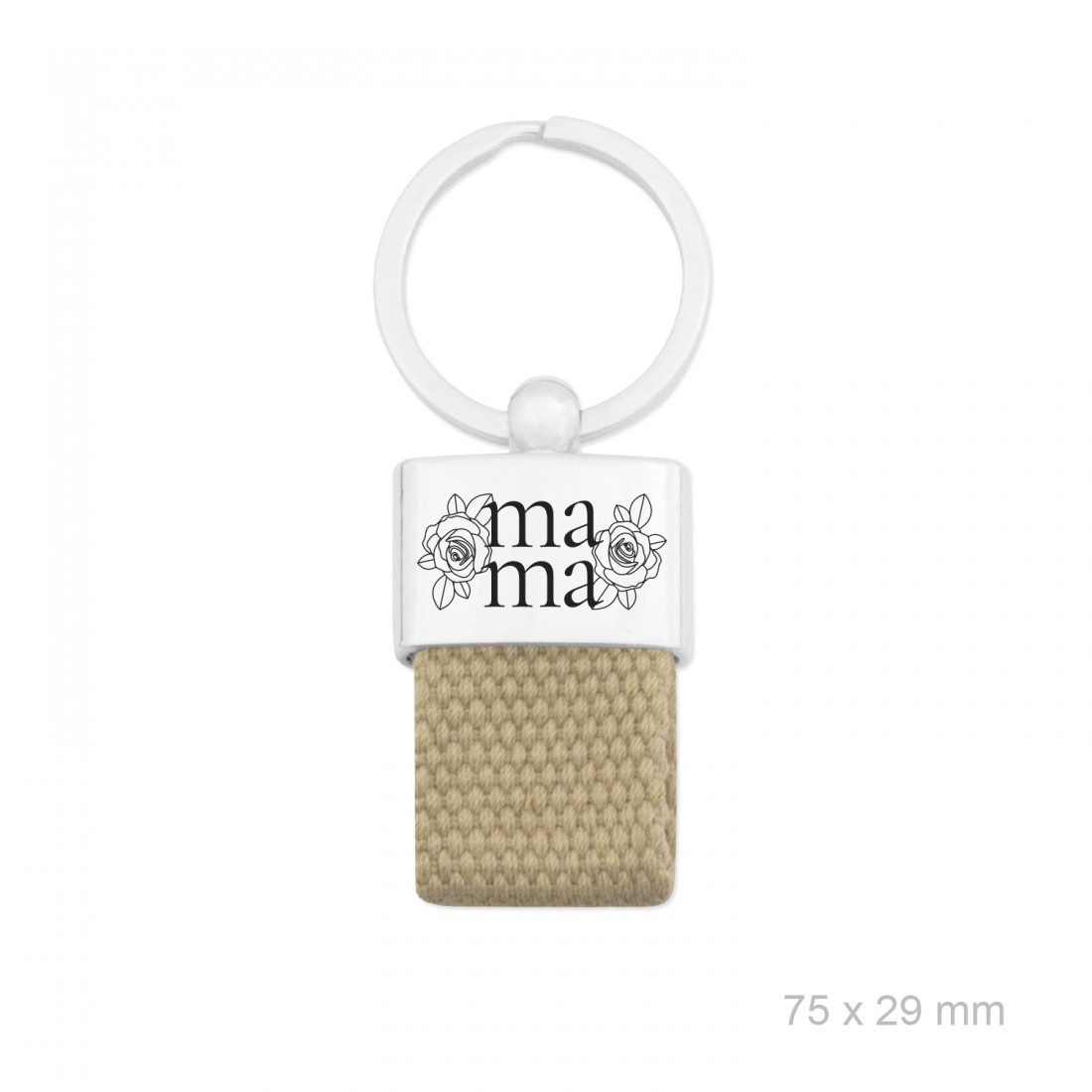 Llavero de metal con motivo de MAMA y tela de algodón de color camel.