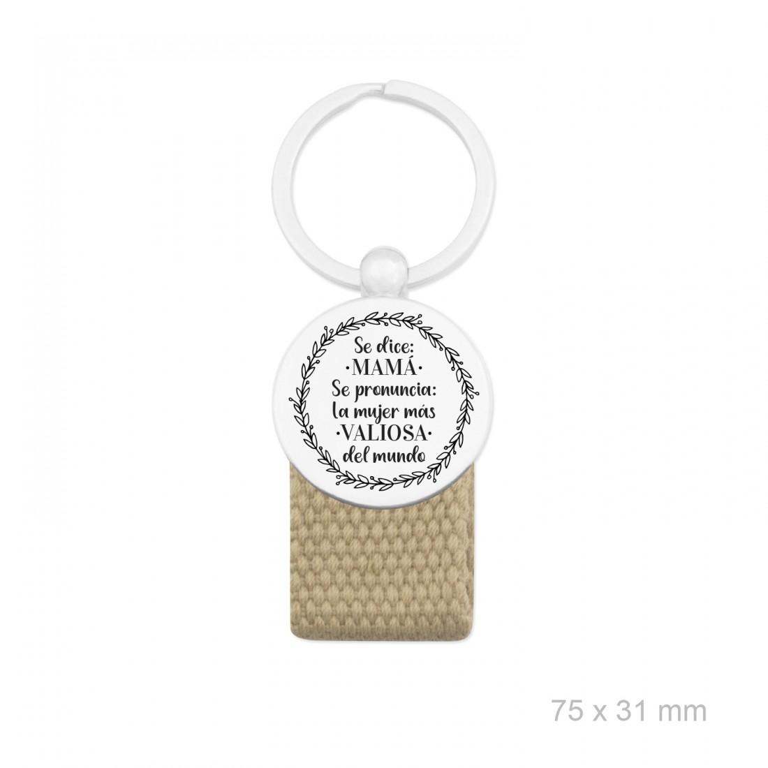 Llavero de metal con motivo de MAMA y tela de algodón de color camel.