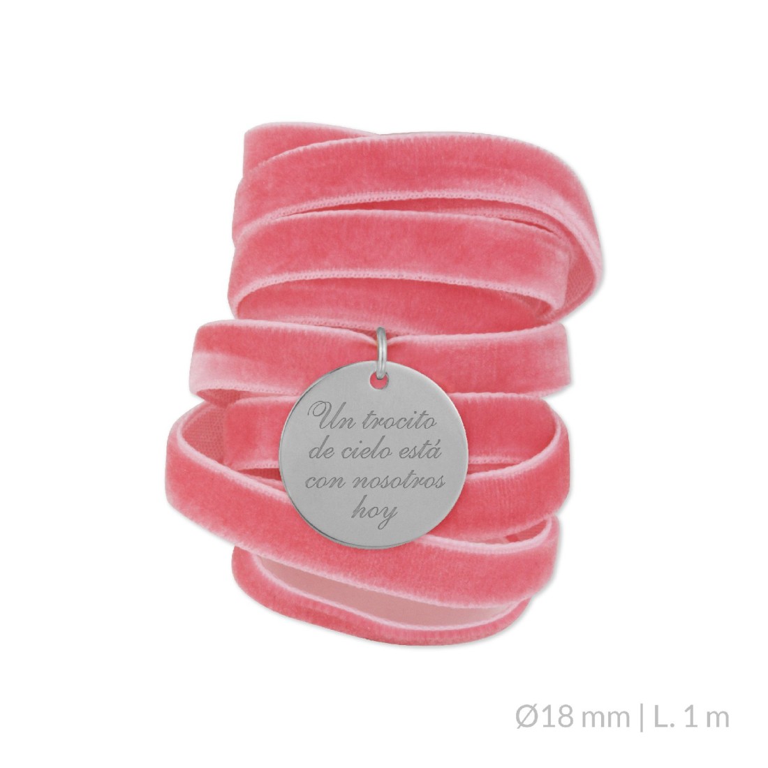 Medalla ramo de novia de Plata de Ley con lazo de terciopelo rosa personalizable con texto y números.