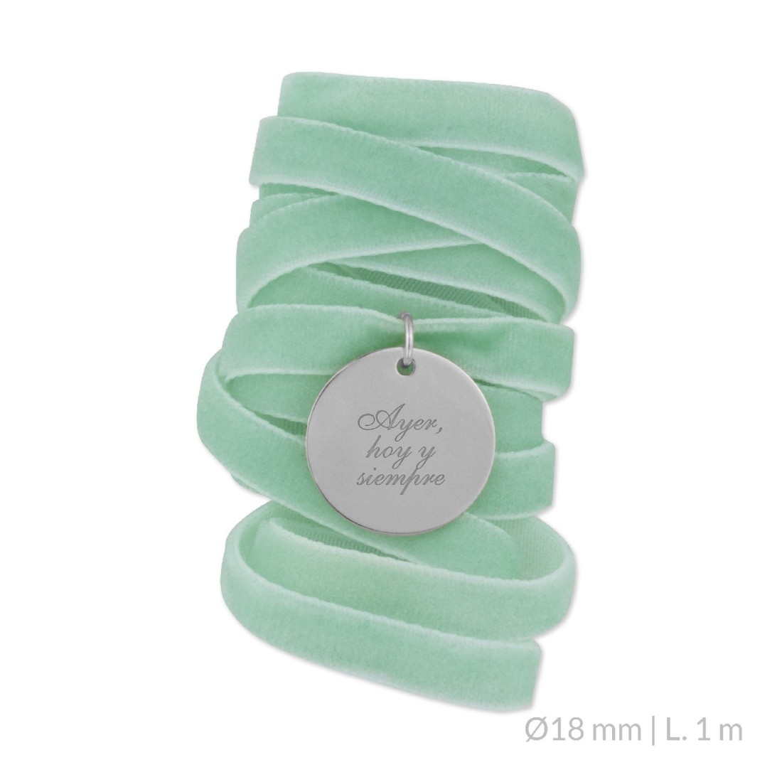Medalla ramo de novia de Plata de Ley con lazo de terciopelo verde agua personalizable con texto y números.