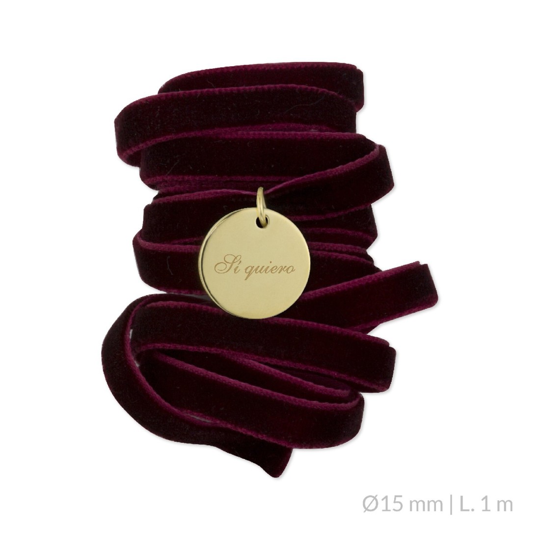 Medalla ramo de novia de Plata de Ley chapada en oro con lazo de terciopelo burdeos personalizable con texto y números.