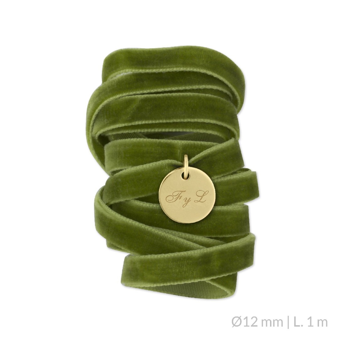 Medalla ramo de novia de Plata de Ley chapada en oro con lazo de terciopelo verde oliva personalizable con texto y números.