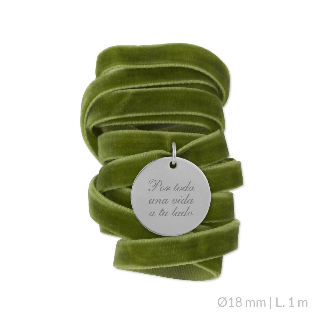 Medalla ramo de novia de Plata de Ley con lazo de terciopelo verde oliva personalizable con texto y números.