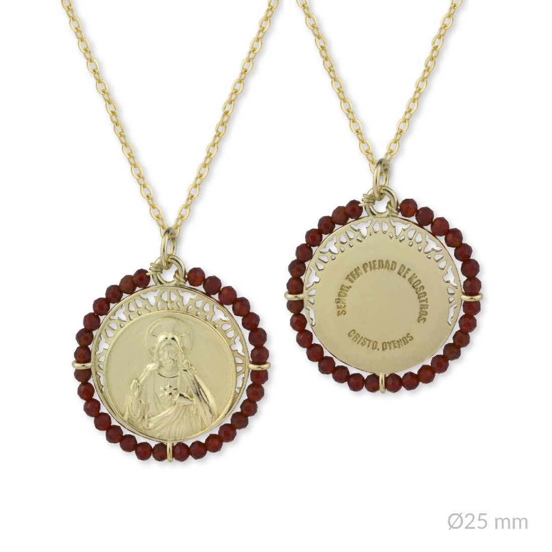 Delicada medalla cuya rocalla granate simboliza el corazón de Jesucristo, como un símbolo de amor divino. Jesucristo concibe el corazón como centro de su entrega y amor total. En el anverso podemos ver un exquisito relieve de Jesús con un acabado pulido que contrasta con el fondo mate arenado, aportando un contraste que resalta la imagen. En el reverso, tenemos en bajorelieve el texto "Señor, ten piedad de nosotros. Cristo óyenos".
