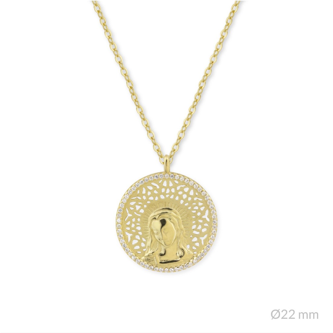 Tamaño de la medalla: Ø22 mm. Tamaño de la circonita: Ø0.80 mm. Color de la circonita: Blanco calidad superior.