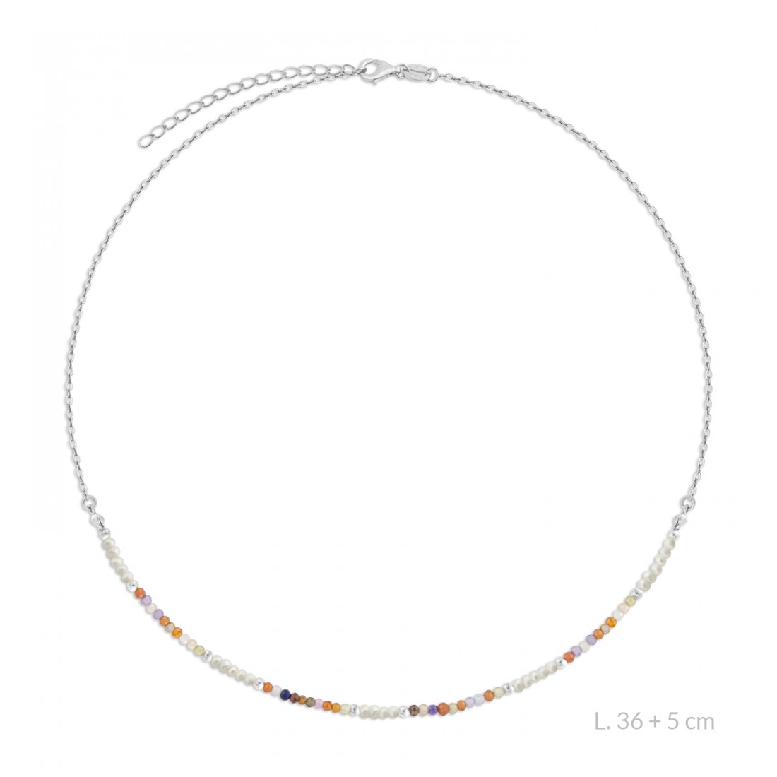 Gargantilla de Plata de Ley con perla barroca, rocalla facetada multicolor de 2 mm y 10 bolitas de plata. Tanto la piedra natural como la perla puede tener variaciones de color y tamaño.
