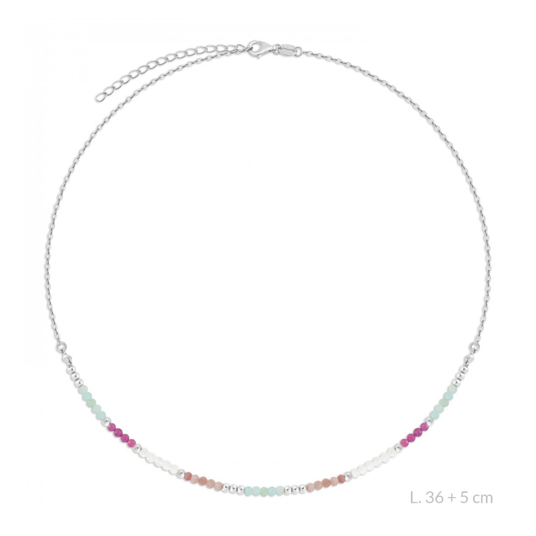 Gargantilla de Plata de Ley con aguamarina, cuarzo blanco, cuarzo fresa, cuarzo rosa facetados de 2 mm y detalles con bolitas de plata. La piedra natural puede tener variaciones de color.