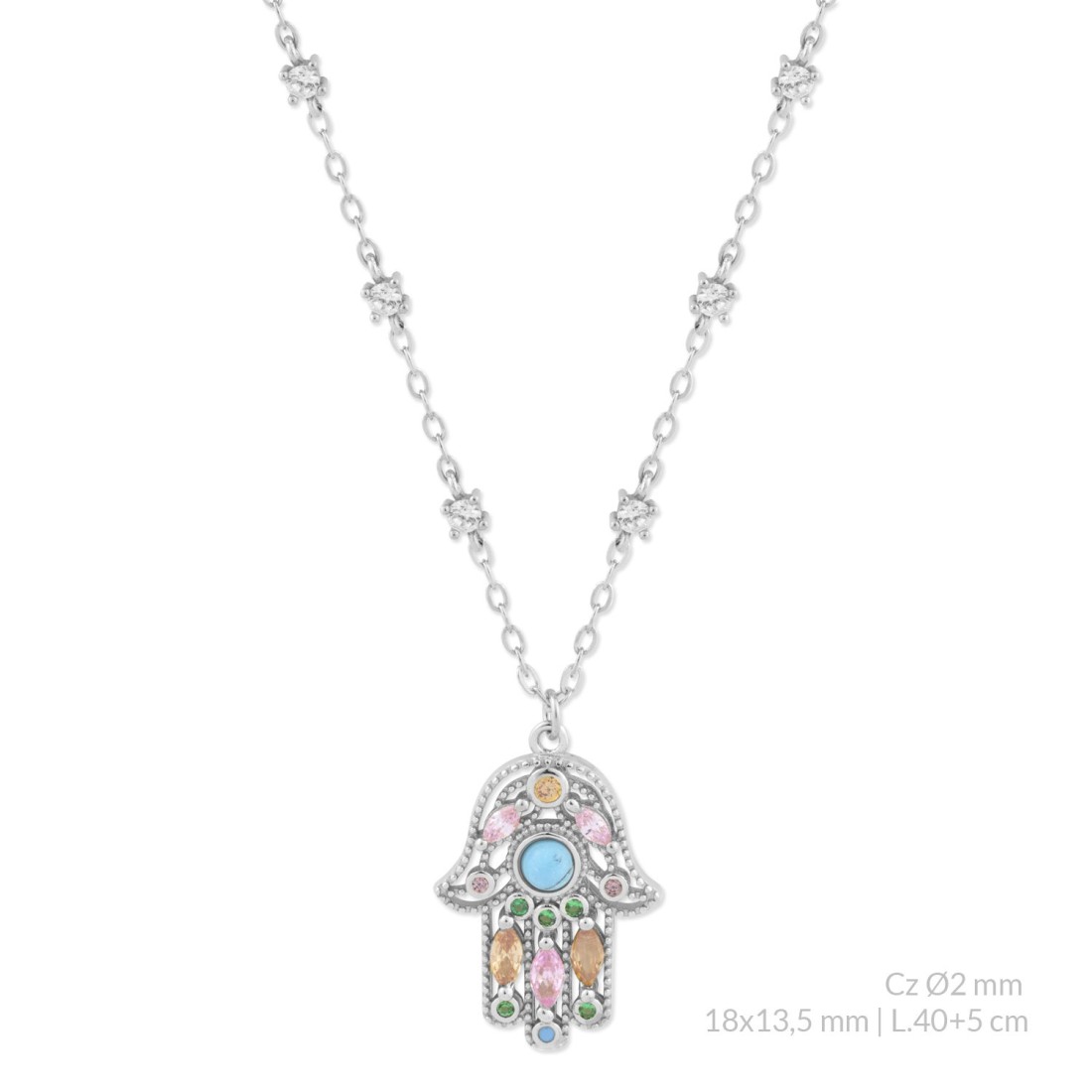 Gargantilla de Plata de Ley con la Mano de Fátima, circonitas de color y turquesa.