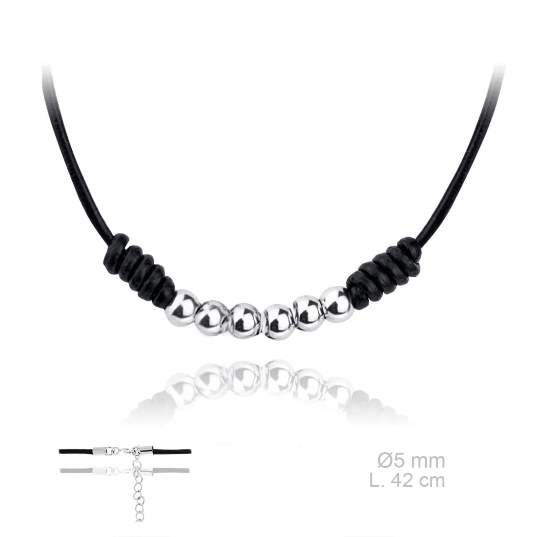 Gargantilla de cuero negro y 6 bolitas con terminales de Plata de Ley | L. 42+5cm