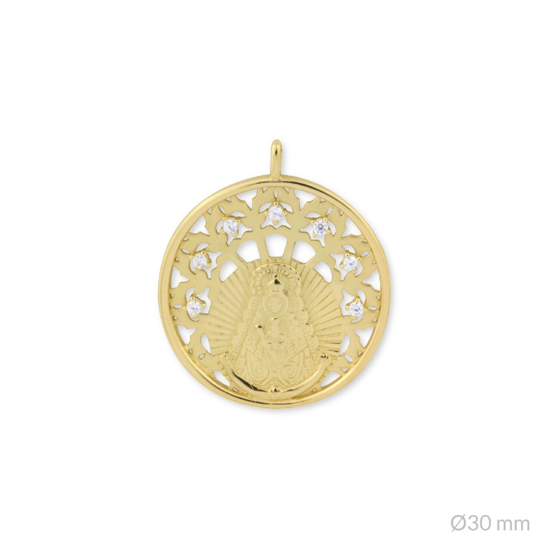 Tamaño de la medalla: Ø30 mm. Tamaño de la circonita: Ø2 mm. Color de la circonita: Blanco calidad superior.